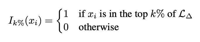 사용 토큰의 비율을 k%로 할 때 토큰의 초과 손실을 기준으로 사용할 토큰을 아래와 같이 정합니다.