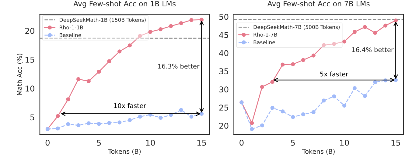 위 그래프는 보통의 언어 모델로 학습한 것보다 RHO-1로 학습한 것이 5~10배 더 빠르다는 것을 보여준다.